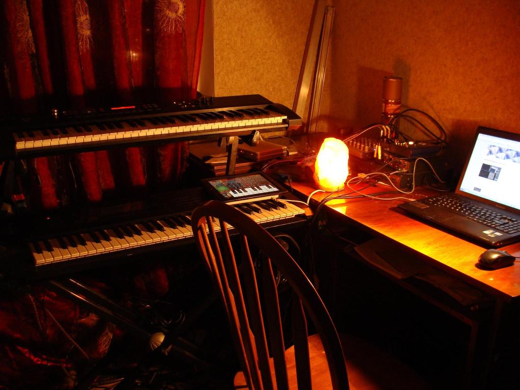 On the other hand, I have accrued some hardware – and completely legalized my software. On the stand there are Roland Juno-D (1st gen), and Korg O1/W FD, along with the iPad 3 running some synth. There were quite a few interesting software synths for iPad, especially Waldorf Nave.